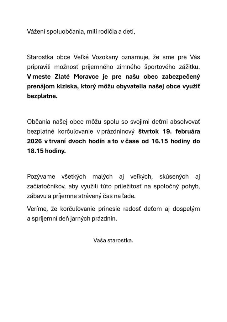 Starostka obce Veľké Vozokany oznamuje, že sme pre Vás pripravili možnosť príjemného zimného športového zážitku. V meste Zlaté Moravce je pre našu obec zabezpečený prenájom klziska, ktorý môžu obyvatelia našej obce využiť bezplatne.